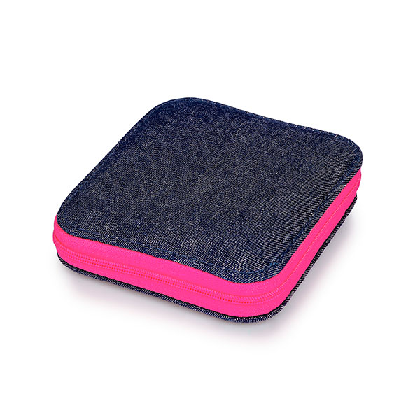 Привлекательный цветовой контраст благодаря замку-молнии, Наполнение:сантиметровая лента, ножницы, устройство для распарывания швов, наперсток, нитевдеватель, ассортимент ниток 8шт, ассортимент игл швейных, английские булавки, булавки, пуговицы, кнопки пришивные.темно-синий джинс с ярко-розовой молнией